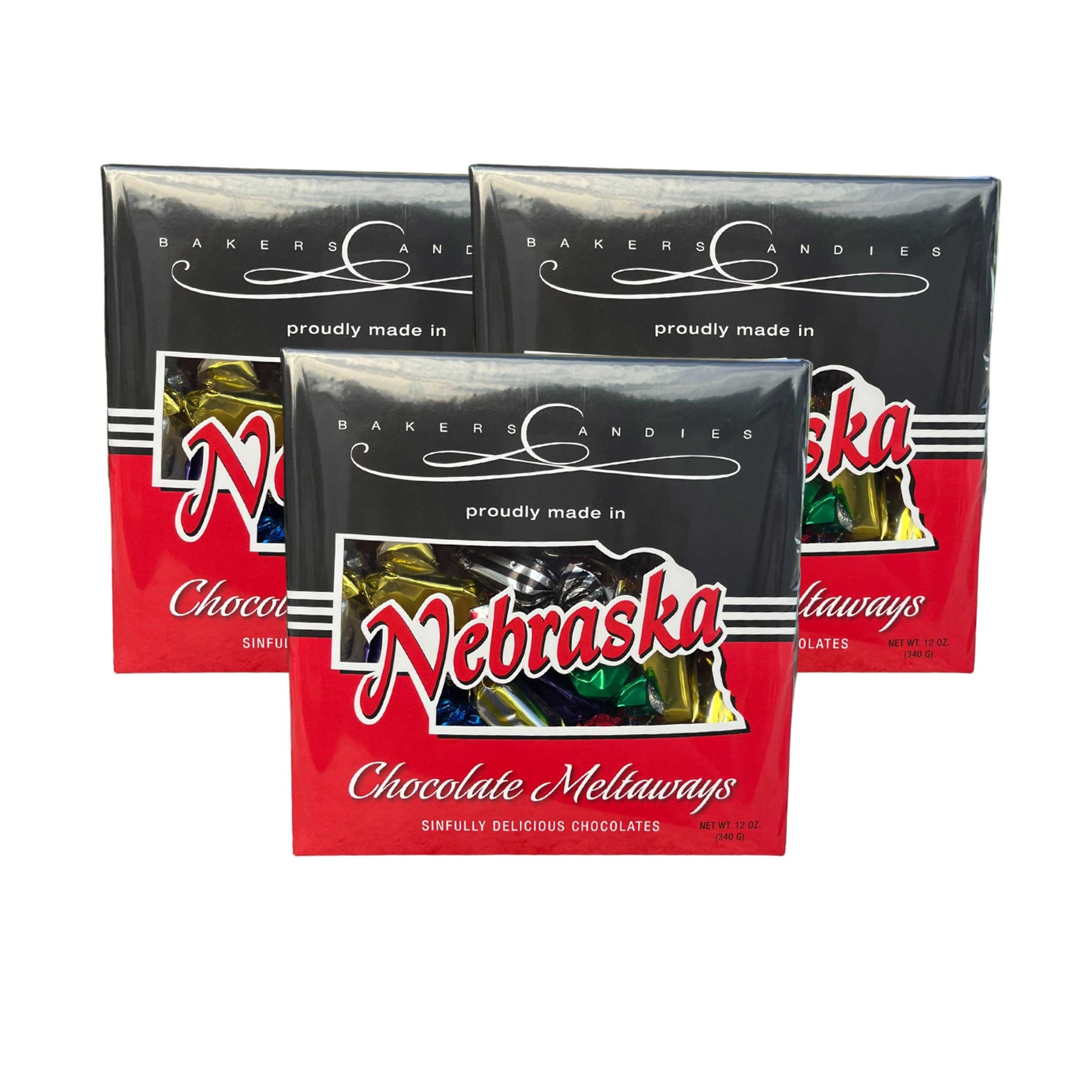 Enjoy the taste of Nebraska with Bakers Candies’ iconic Chocolate Meltaways, now in a Nebraska-themed gift box. This 3-pack offers a variety of rich, creamy meltaway chocolates wrapped in vibrant foils, perfect for gifting, sharing, or savoring yourself. Proudly made in Greenwood, Nebraska, these chocolates are a sweet taste of Midwest tradition.