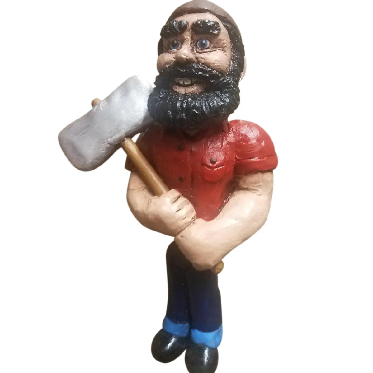 Paul Bunyon lumberjack ornament with large forarms, big bushy beard and eyebrows and holding a large axe, shown on a white background