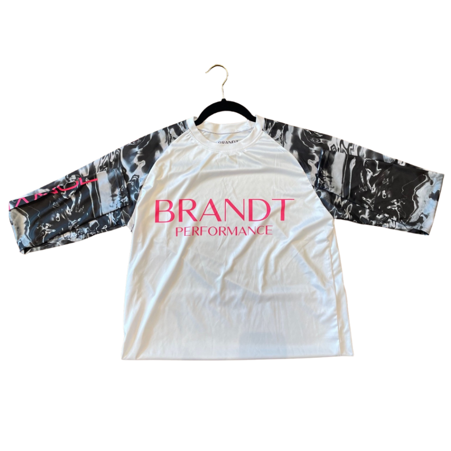 Adult-Brandt Performance Long Sleeve Performance fishing sun shirts protects against harmful UV rays with UPF 50 sun protection blocking 96-99% solar rays. Front with Brandt Performance, Performance on the sleeve, and middle back with Brandt all in hot pink lettering.