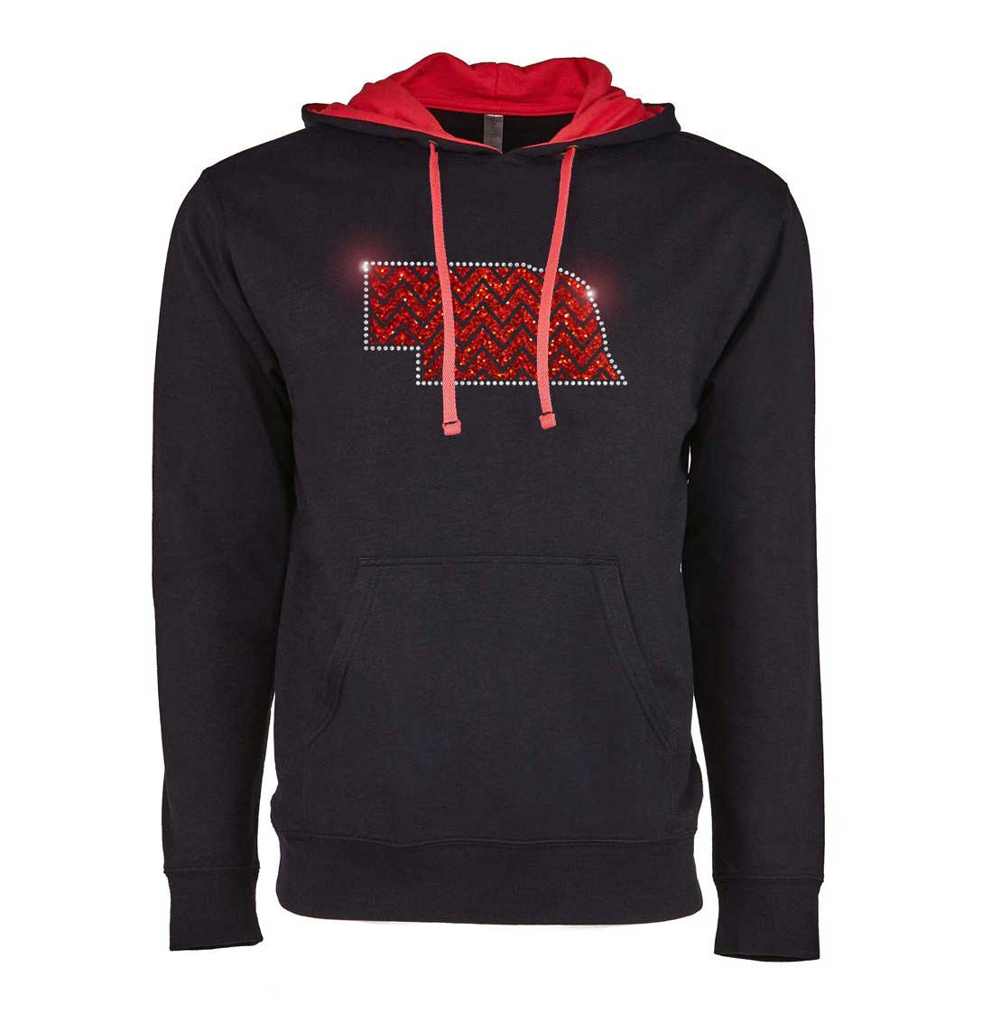 This bold and cozy hoodie brings Nebraska pride to life with serious sparkle. Featuring a red chevron pattern inside the outline of the state, the design is accented with rhinestones for a shimmering effect that catches the light. The contrast red hood and drawstrings add a pop of color, making this hoodie stand out in all the right ways.