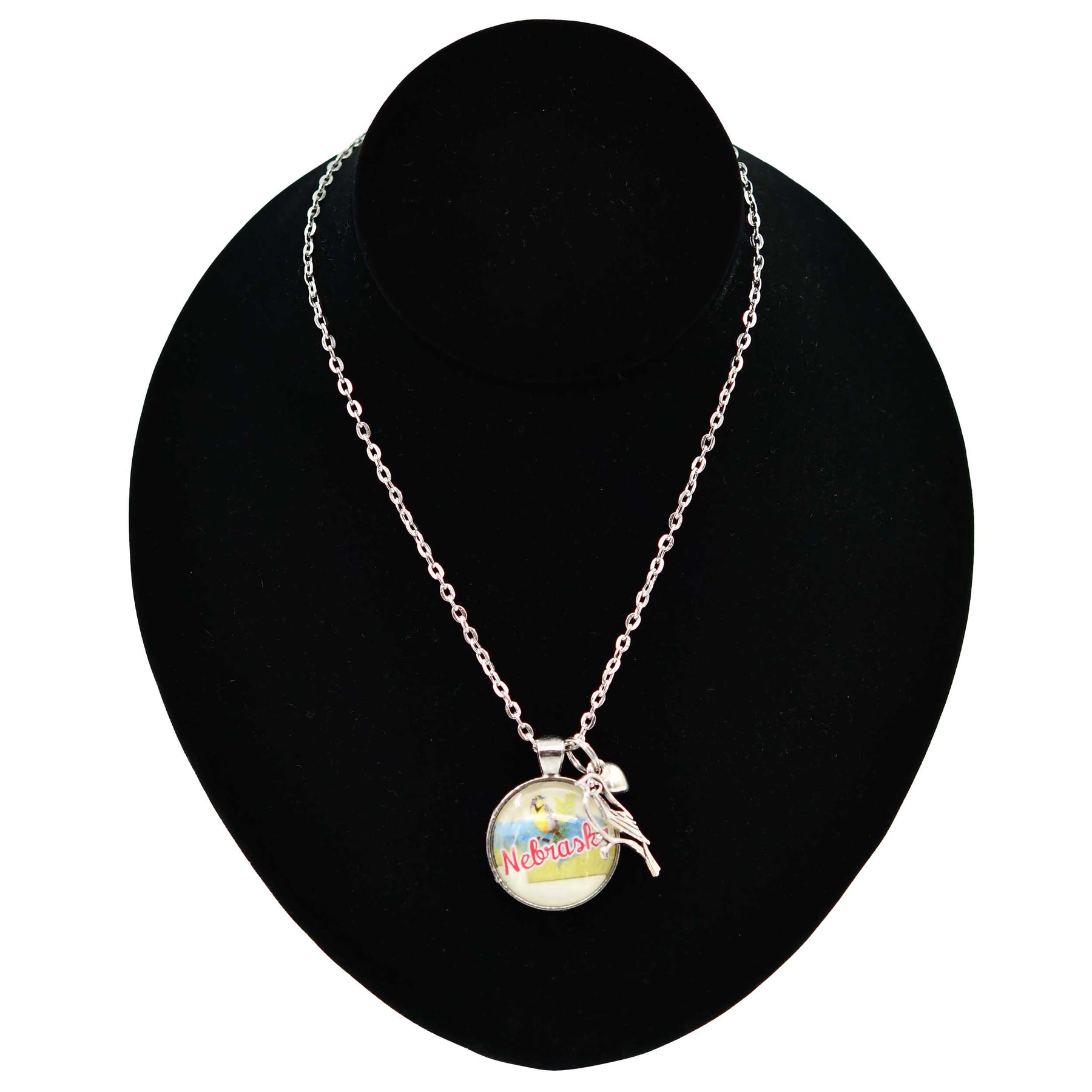 Wear your state pride and love for nature with our Nebraska State Charm Necklace! Featuring the state bird, the Meadowlark, in a beautifully designed 1"X1" charm, this necklace comes in multiple colors and includes a 24" silver chain. A charming addition to any outfit, and a great way to show your love for Nebraska and its wildlife!
