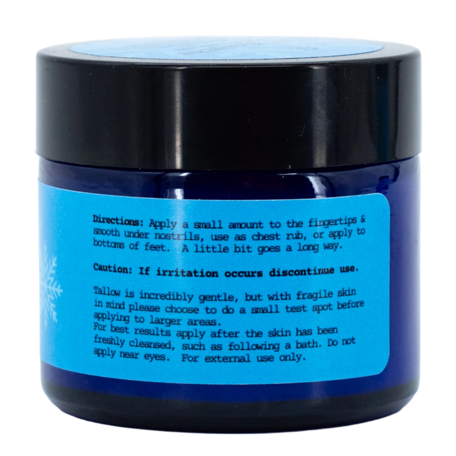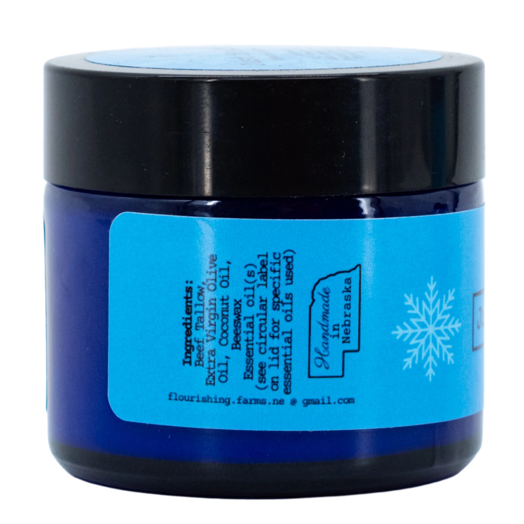 Beef Tallow, Extra Virgin Olive Oil, Coconut Oil, Beeswax, infused with Fir, Rosalina Leaf, Black Spruce, Cypress, Spearmint, Eucalyptus, and Virginian Cedarwood oils