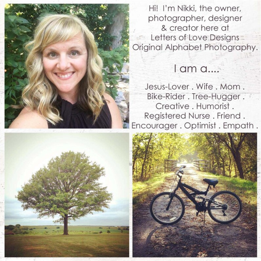 Nikki is the photographer, designer, maker and owner of Letters of Love Designs. Her journey began in 2009 which she began photographing nature and architecture that look like letters and making them into works of art. Based in Raymond, Nebraska.
