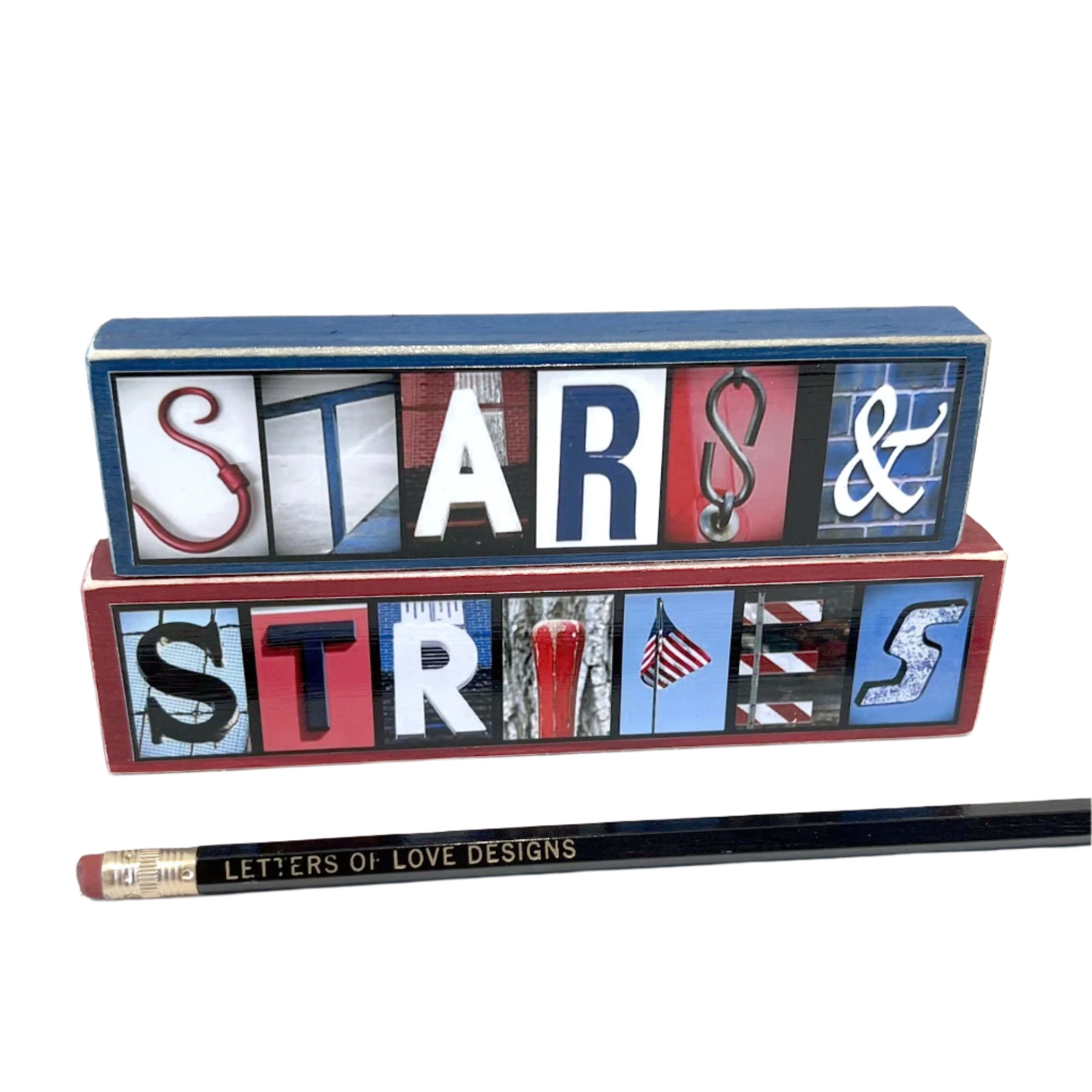 Celebrate patriotism with a heartfelt, artistic touch. Our God Bless America Word Block Set features beautifully arranged alphabet photo art, where each letter is created from real-life architectural and natural elements that resemble the alphabet. This unique design from Letters of Love Designs adds rustic charm and meaningful style to any home or office.