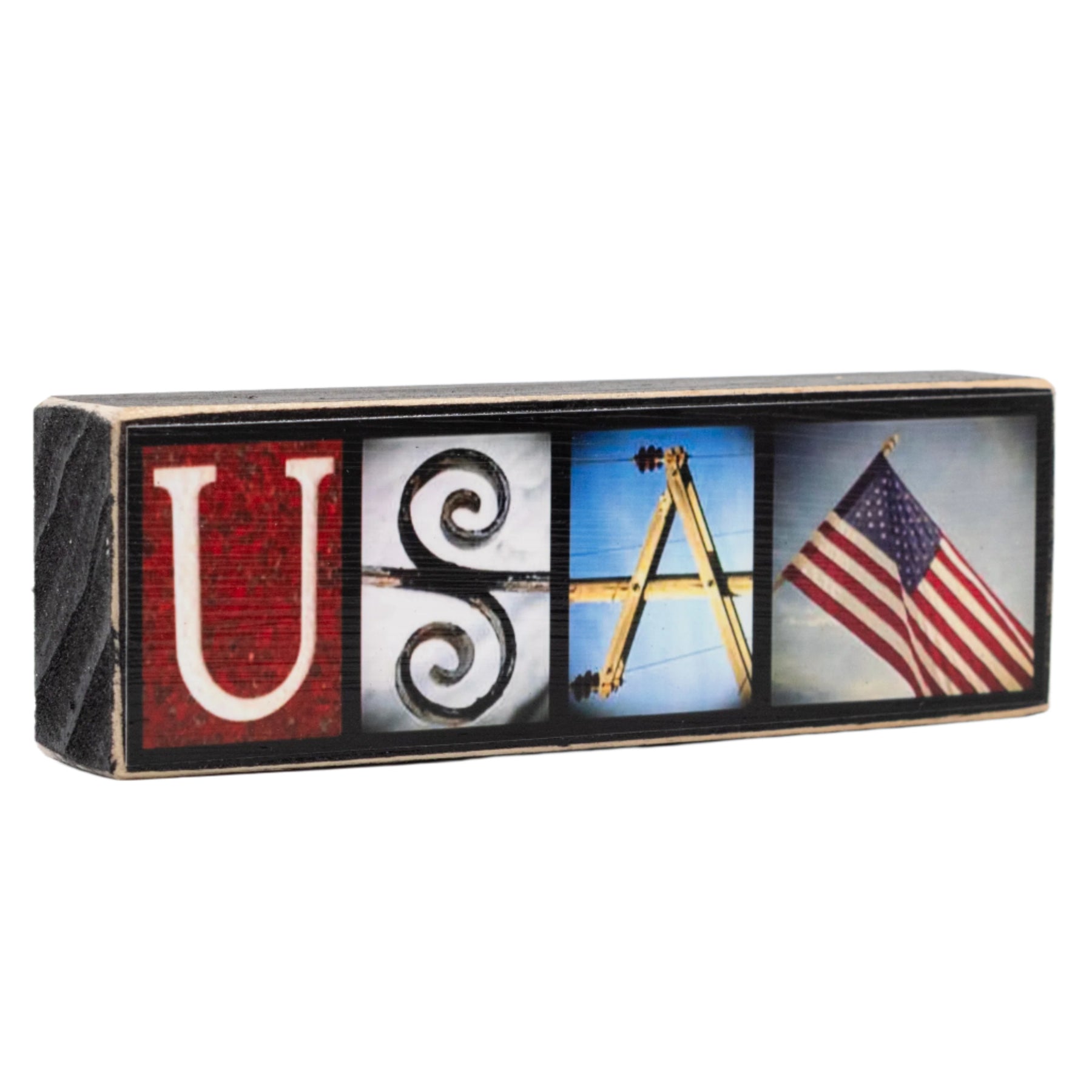 Show your American pride with this bold USA word block, featuring red, white, and blue alphabet photo art captured by Letters of Love Designs. Handcrafted in Nebraska, it's a unique and festive piece perfect for patriotic holidays or year-round display.