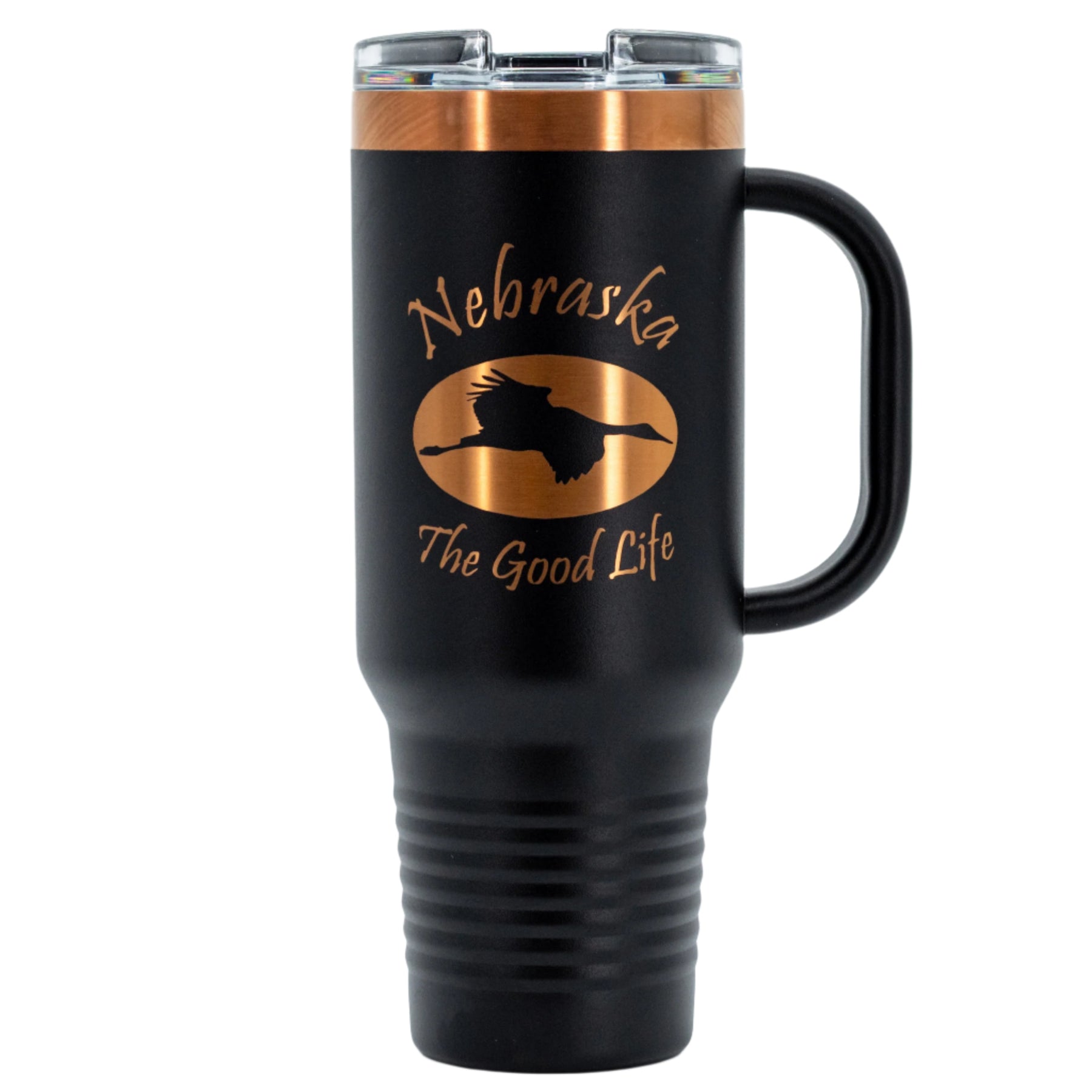 Stay hydrated in style with this 40 oz. stainless steel tumbler featuring a stunning sandhill crane design—perfect for bird lovers and outdoor enthusiasts alike. Built with double-wall insulation, this tumbler keeps your favorite drinks hot or cold for hours. The sturdy handle and spill-proof lid make it ideal for life on the go, and the included straw adds convenience with every sip.