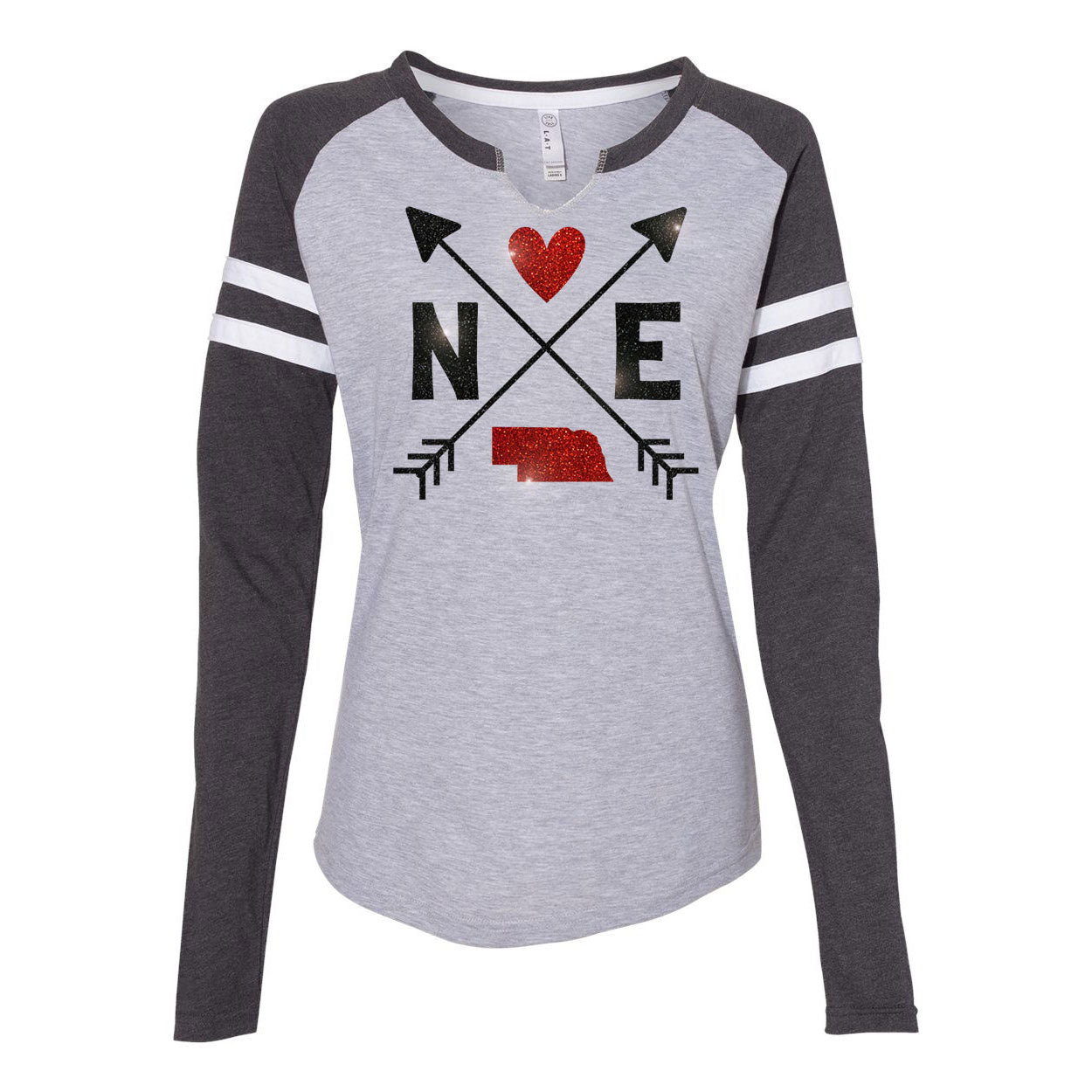 Celebrate your love for Nebraska with this bold and stylish long sleeve tee! Featuring a striking crossed-arrows design with a glittery red heart and Nebraska state silhouette, this shirt is perfect for anyone who holds the Cornhusker State close to their heart.