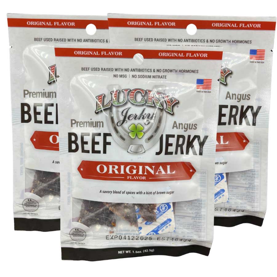 A package of Lucky Premium Jerky, Angus Beef, BBQ Flavor, with a claim of no antibiotics, no growth hormones, and no MSG. The package is white with product images and branding details.