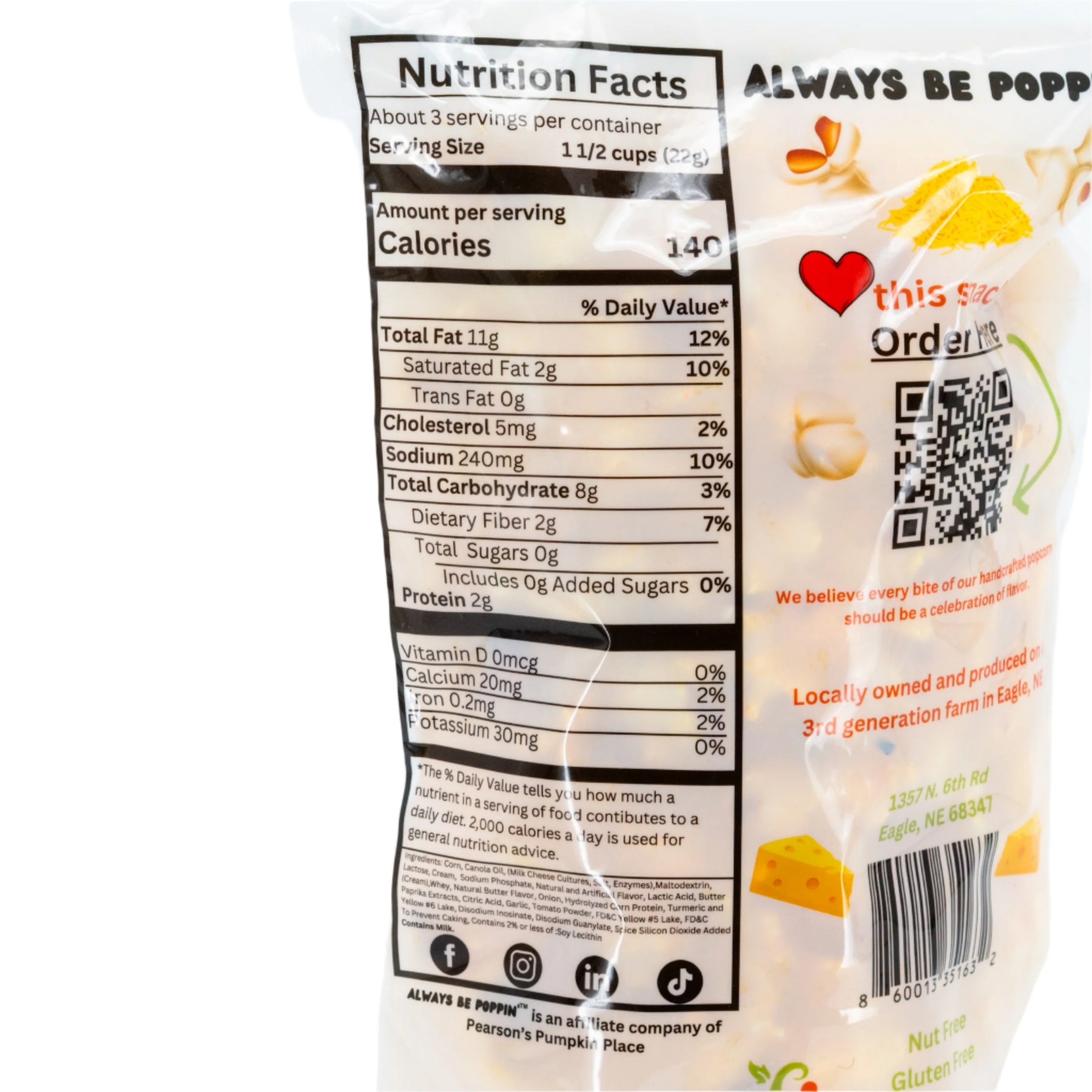Packaged in a convenient resealable bag, this popcorn stays fresh longer—perfect for snacking anytime, anywhere. Whether it's shared with friends or savored solo, this cheddar popcorn brings comfort, flavor, and peace of mind in every handful.