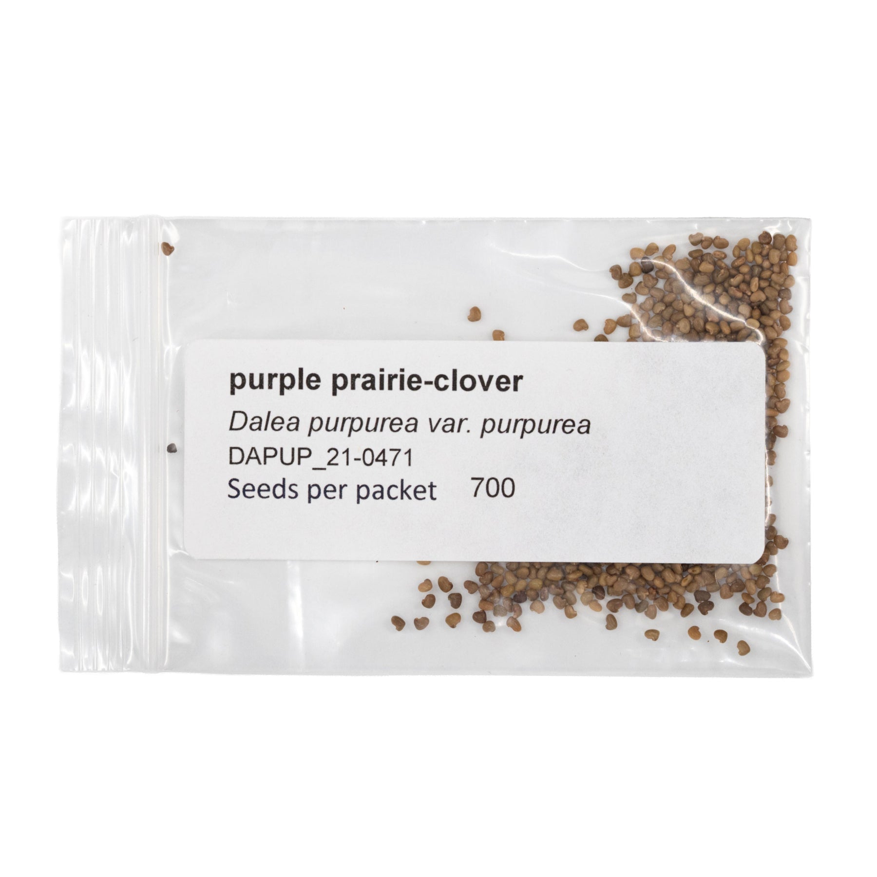 Seed packet labeled 'purple prairie-clover' with seeds visible on a white background