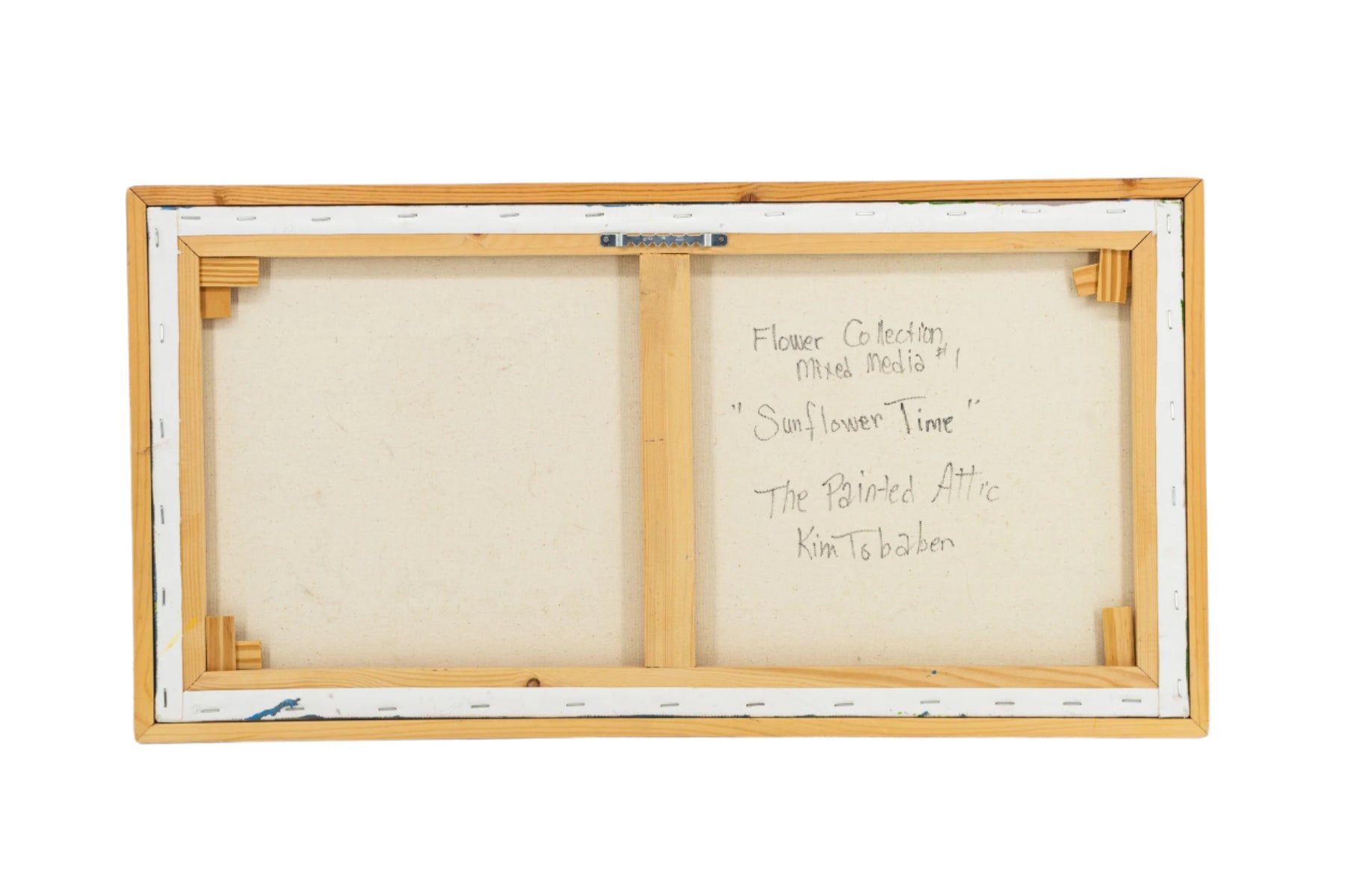 This vibrant painting features a cheerful arrangement of sunflowers in bright turquoise mason jars, captured in a bold, textured impasto style. Thick brushstrokes bring the golden petals and lush green leaves to life, creating a joyful contrast against the muted background of rustic red brick and soft gray tones. A collage element in the bottom left corner adds vintage charm, featuring clock imagery and soft floral patterns. Framed in warm wood, this piece combines country farmhouse aesthetics with expressive artistry, making it a striking addition to any home.
