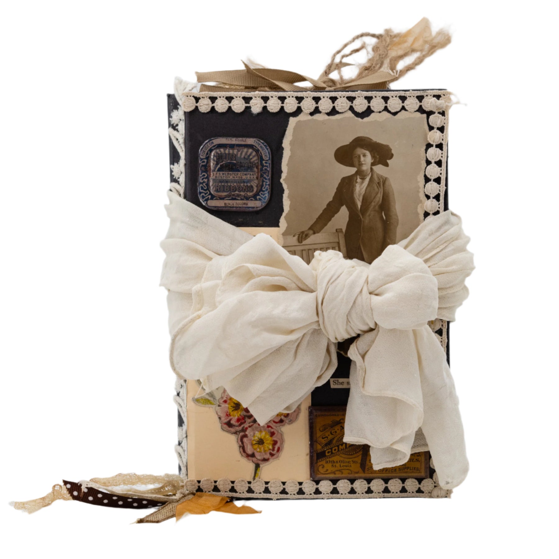 Step into a world of nostalgia with this one-of-a-kind, 43-page Vintage Treasures Junk Journal. Bursting with hand-selected antique cutouts, charming magnets, and timeworn souvenirs, every page invites you to explore the past through a beautifully layered collage of history and imagination.
