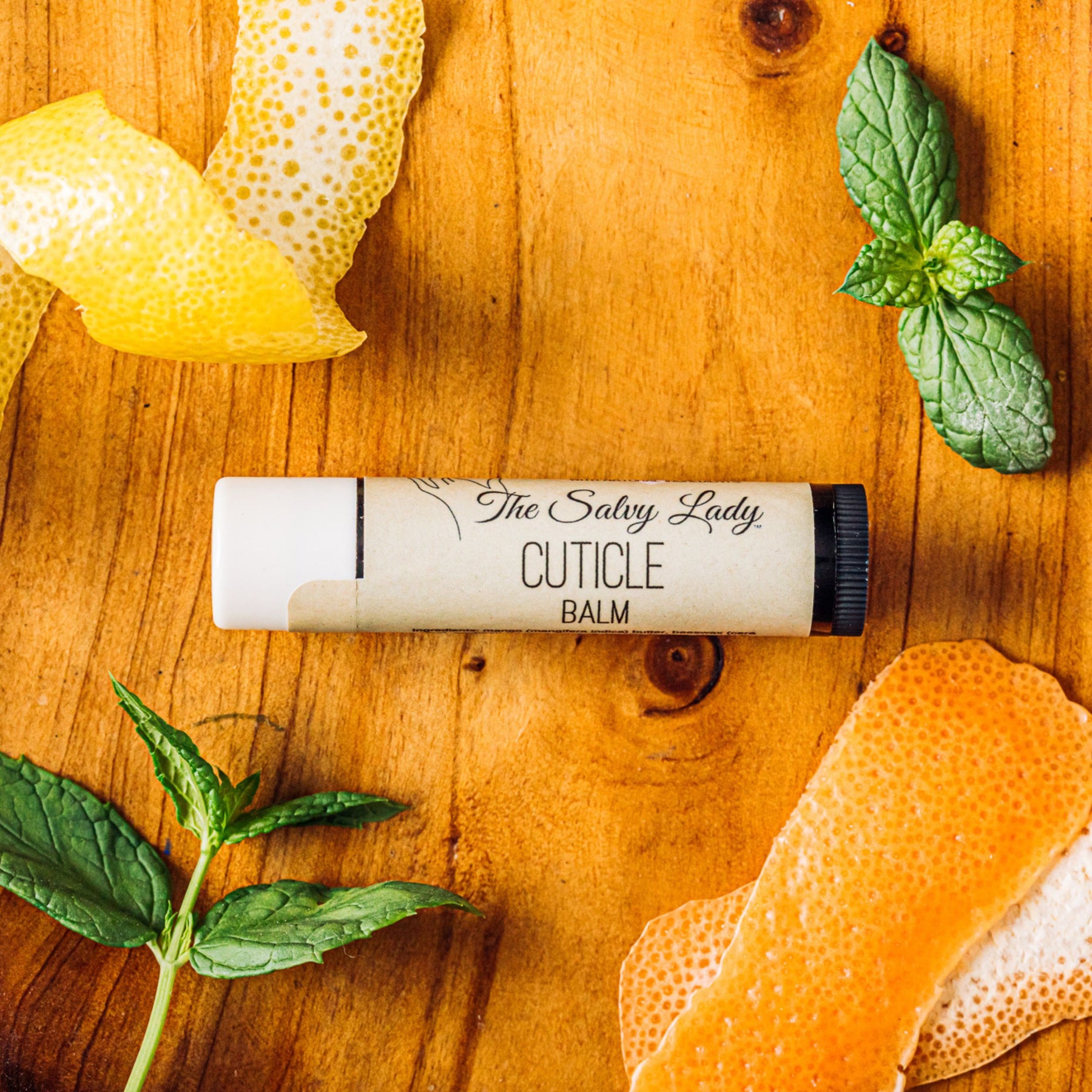 Cuticle Balm: mango butter, beeswax, soybean oil, lanolin, lecithin, vitamin E oil, peppermint oil, lemon oil, grapefruit oil