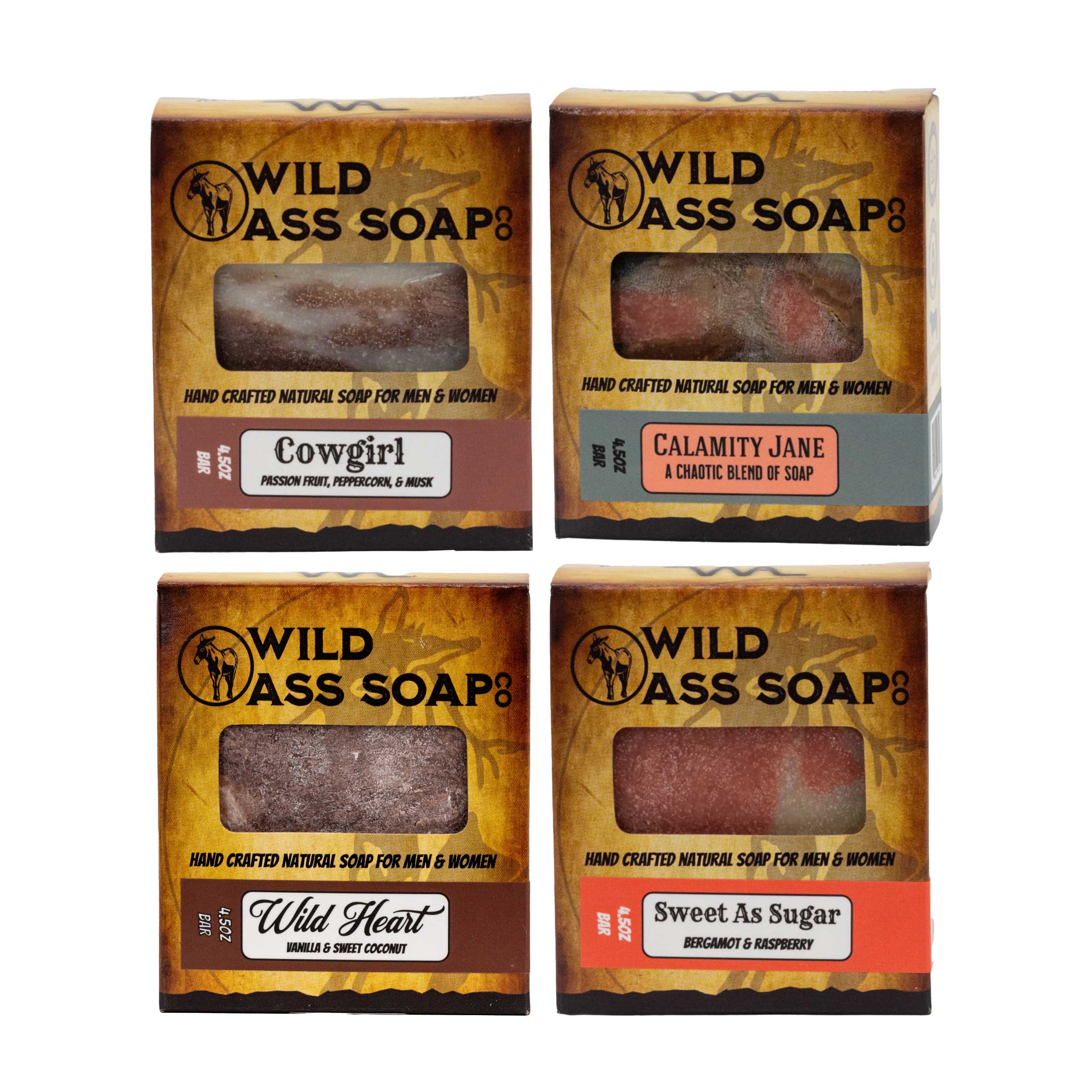 The Wild Ass Soap Masculine Scent Package brings together four bold, handcrafted soaps designed with rugged, timeless scents. Each bar is made in small batches with natural ingredients, offering a rich lather and long-lasting fragrance. From the smooth notes of sandalwood and vanilla to the classic aroma of bay rum, cherry tobacco, and cedar leather, this collection is perfect for men who enjoy distinctive, masculine scents with every wash.