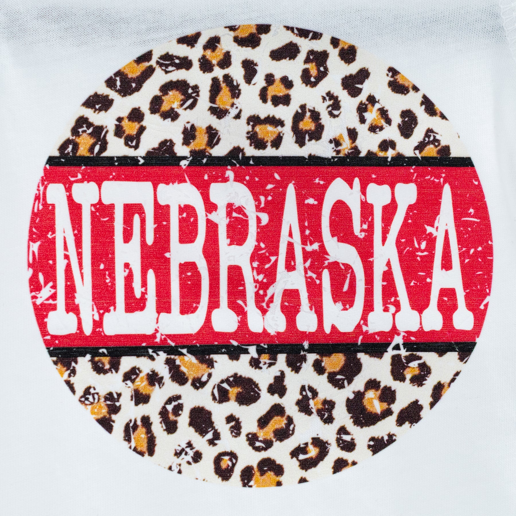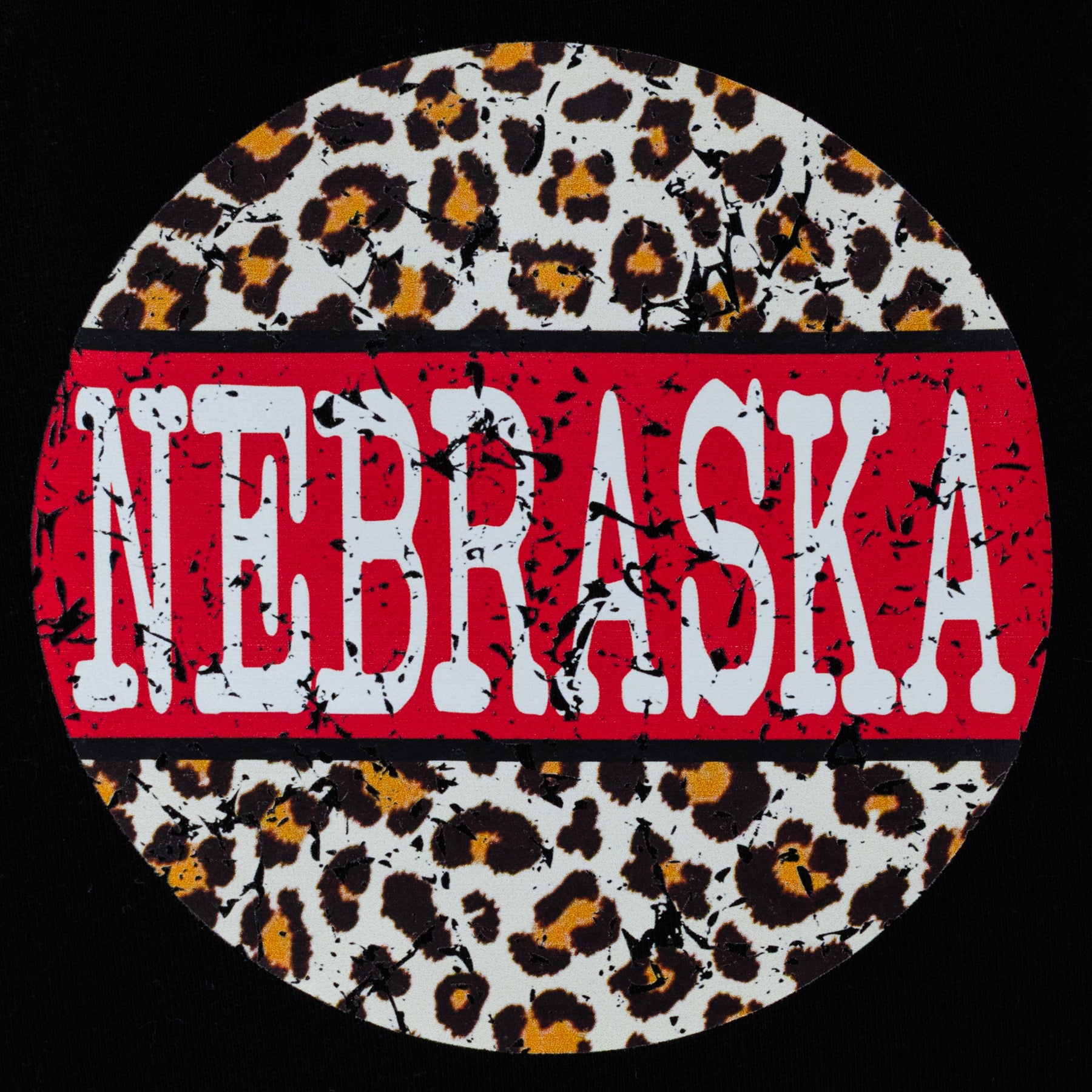 Design: Leopard print circle with bold Nebraska stripe in red and white