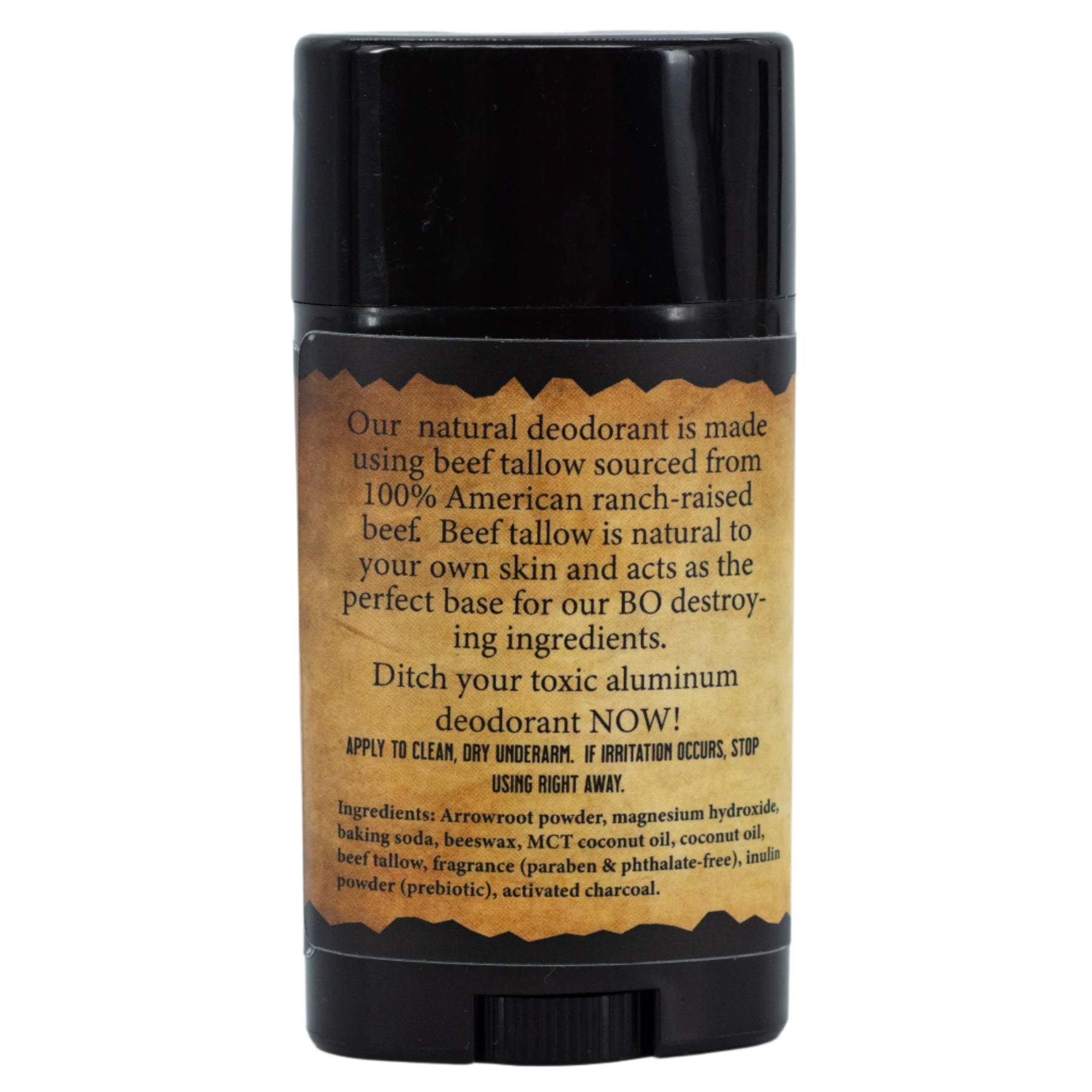 Arrowroot powder, magnesium hydroxide, baking soda, beeswax, MCT coconut oil, coconut oil, beef tallow, fragrance (paraben & phthalate-free), inulin powder (prebiotic), activated charcoal.