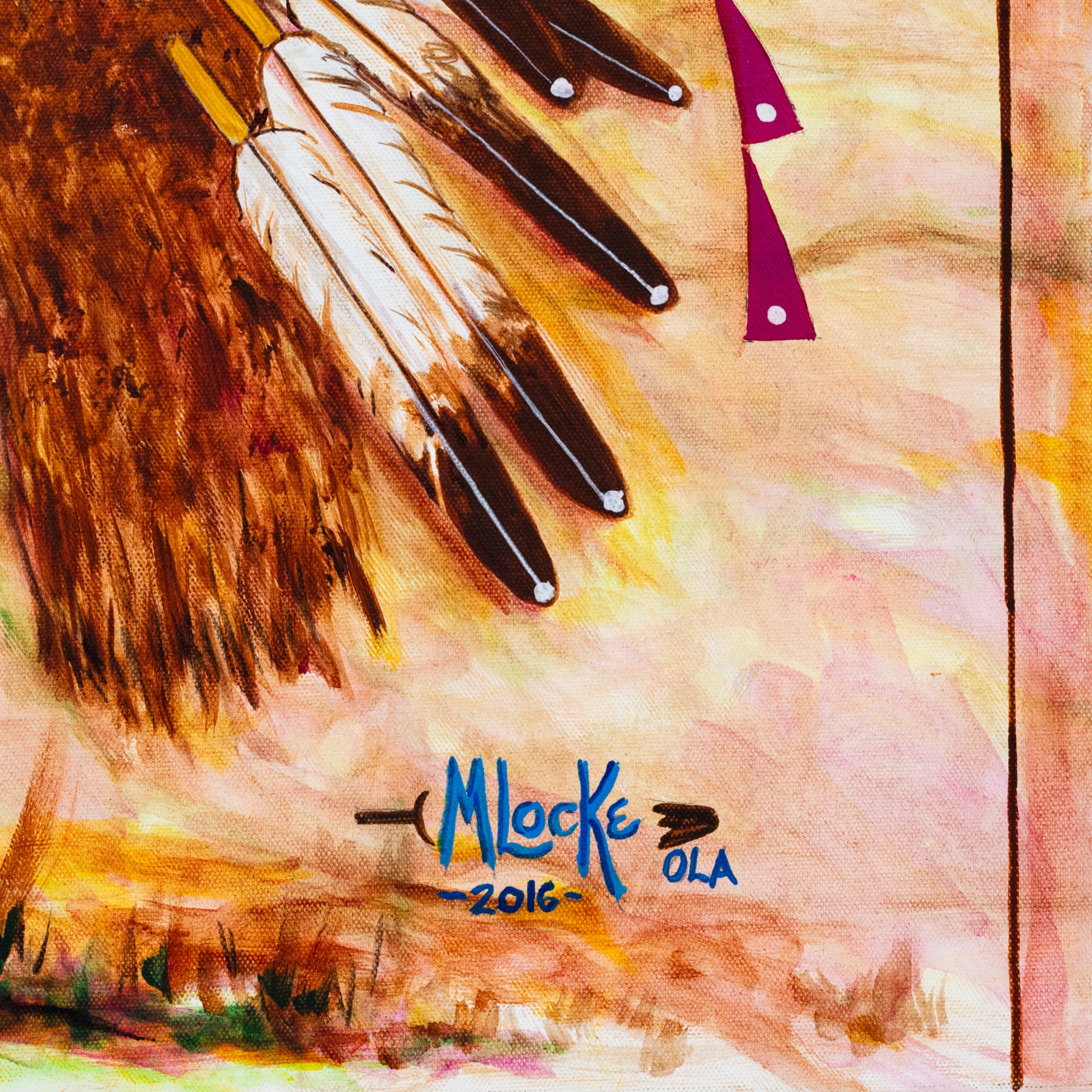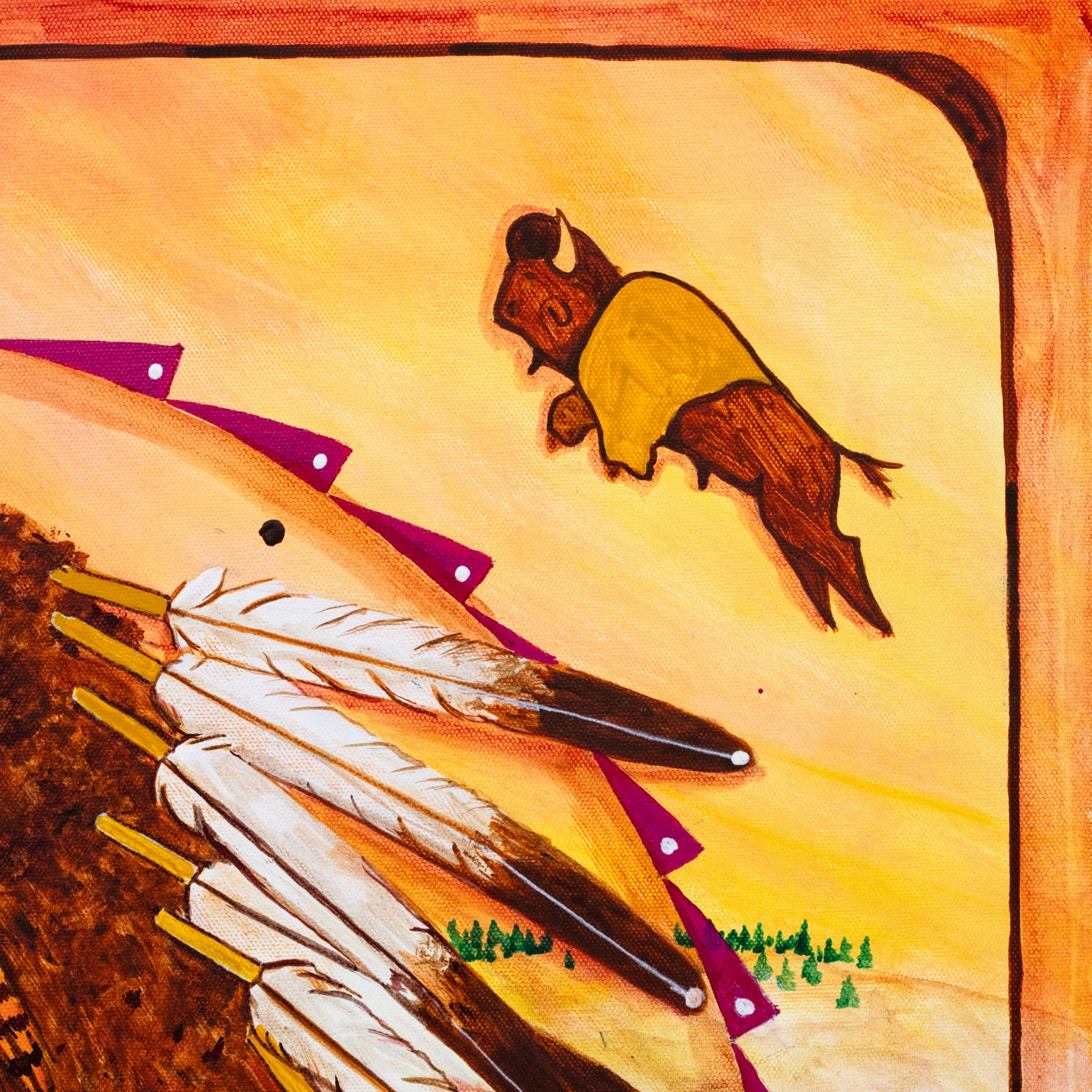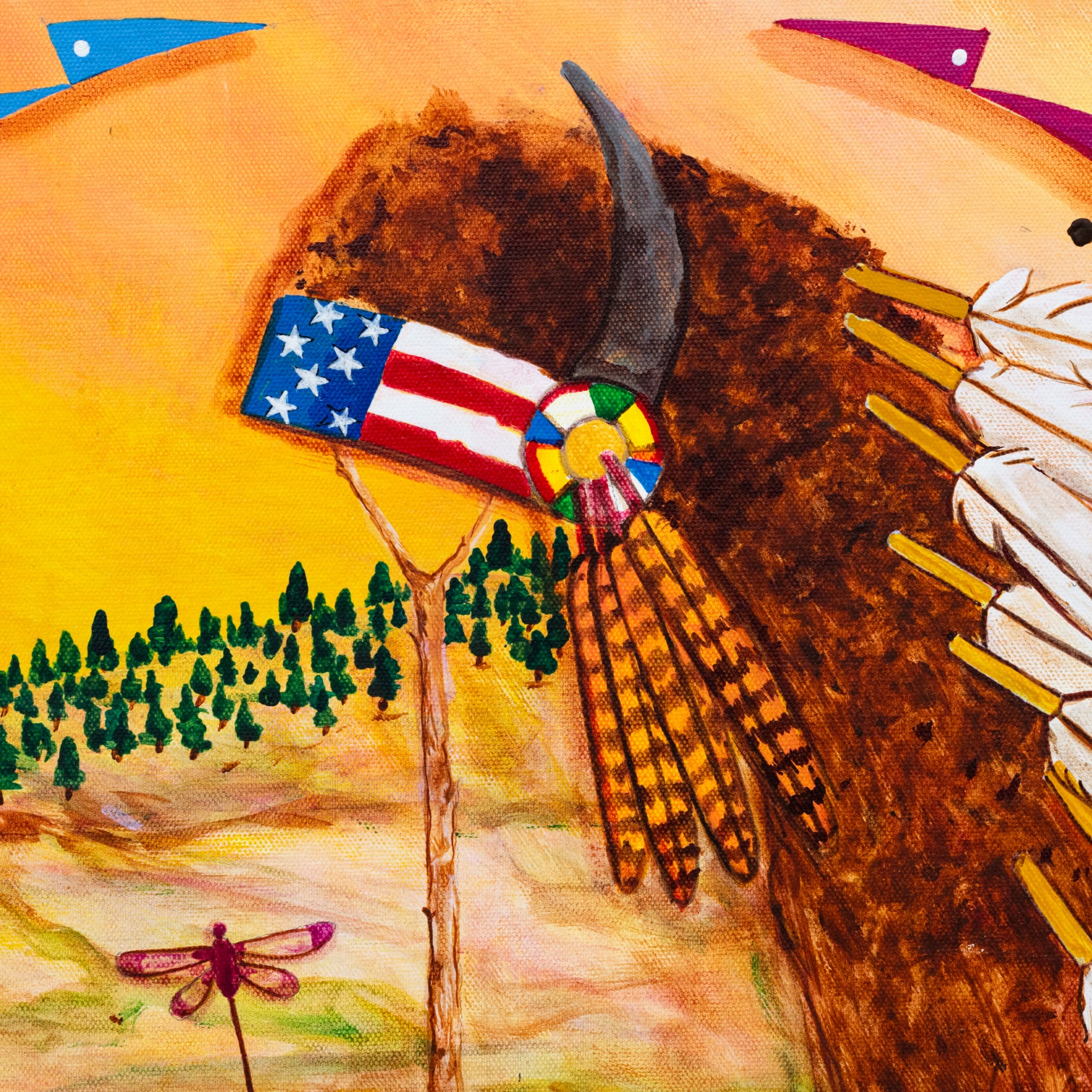 This vibrant and symbolic painting blends cultural tradition with a message of strength, unity, and honor. "Comrades of Victory" features a buffalo adorned with a headdress and American flag imagery, set against a warm-toned landscape alive with motion and meaning. Dragonflies dance across the foreground, symbolizing transformation and resilience, while the curved paths and soaring bison evoke spiritual journeys and connection. Bold, intentional brushwork and sacred imagery reflect deep respect for heritage and the enduring spirit of a people.